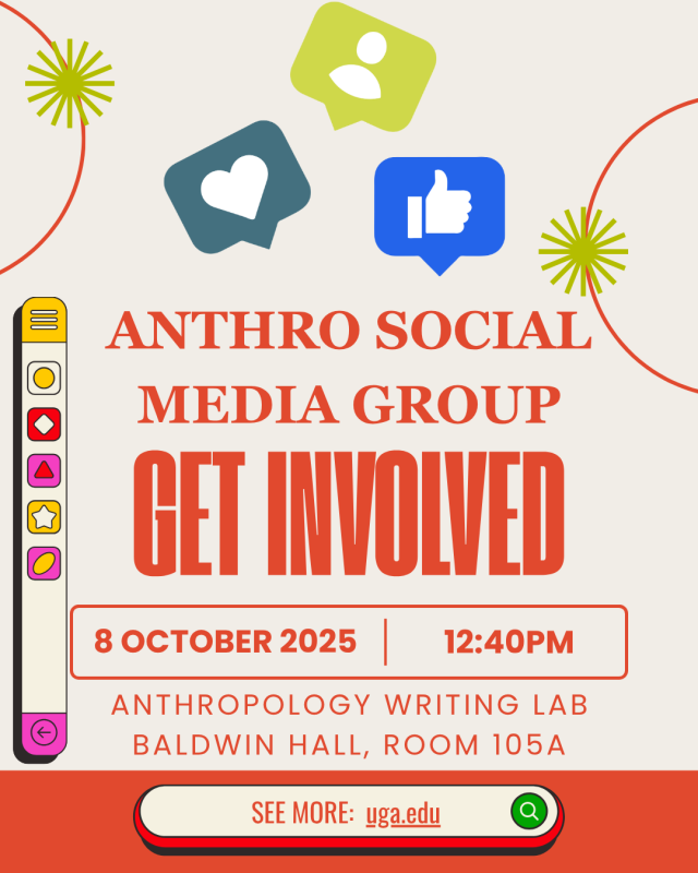 Wednesday, October 8 2025, 12:40 - 1:40pm Anthropology Writing Lab, Baldwin Hall 105A Join us for our inaugural meeting. We will discuss in further detail what to expect from this program, including our goals, topics of interest, and how you can contribute to our vision! No social media experience is needed; social media lovers, creative thinkers, and anyone who is just curious are invited! Both undergrad and grad students are welcome to join as this is an exciting opportunity to build our community while showcasing what makes our department unique! RSVP Here