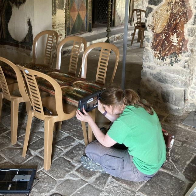 The Laboratory of Tree-Ring and Archaeological Wood Analysis at Georgia (TRAWG) is in Room 170 of the Riverbend North Research Labs and is directed by Dr. Brita Lorentzen. The TRAWG Lab team investigates past human interactions with climate and environment, primarily using dendrochronology (tree-ring science), stable isotope analysis and radiocarbon, and wood anatomy and broader archaeobotanical methods. The scope of our research spans materials from modern ecosystems, cultural heritage and wooden artwork, terrestrial and underwater archaeological sites, and paleoecological contexts, to interpret human-earth system interactions at multiple temporal and spatial scales and apply our work to current environmental and cultural heritage conservation and sustainability efforts. | Dr. Lorentzen collecting tree-ring data by scanning a Byzantine icon in Cyprus. We examine wood materials from sites worldwide, with specialization in underwater and maritime heritage sites (including harbor infrastructure and wooden shipwrecks), wooden heritage in Greece and the Levant, and Indigenous and historical sites in the Northeast US and Canada. We are also developing dendrochronological and environmental archaeological research on heritage sites here in Georgia as part of UGA student research. Our facilities include wet lab space and microtomes for wood and plant tissue sectioning and slide preparation, a drying oven and a muffle furnace for botanical reference specimen preparation and charring, cold storage for waterlogged timbers and botanical materials, incident and transmitted microscopes with cameras for examining and documenting plant and wood specimens, workshop benches and tools for collecting and preparing forest cores and dry wood samples, and flatbed scanners and tree-ring measuring stations for dendrochronological analysis. We collaborate with the Georgia Electron Microscopy facilities and neighboring Center for Applied Isotope Studies (CAIS) for further research requiring high-resolution microscopy, materials dating, characterization and sourcing, and paleoenvironmental analysis. PhD student, Seungyeon Hong, working on charcoal samples in the lab.